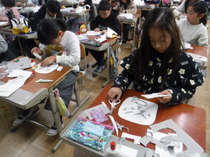 紙版画で鬼の顔を製作中です。みんな丁寧に取り組んでいるので想像以上に時間がかかっていますが、鬼の顔の表情がそれぞれ違っていて楽しい作品ができつつあります。