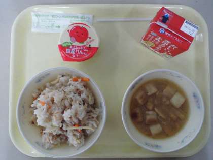 本日の献立のうち「炊きこみ五目ごはん」と「みそ汁」は災害時などに備えた備蓄食を使用しています。