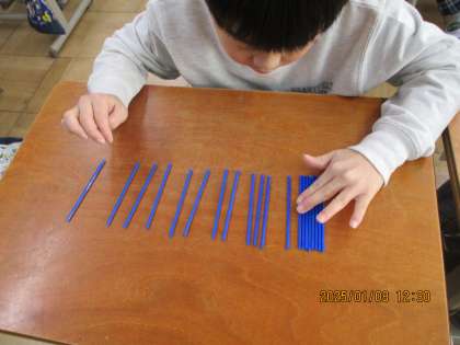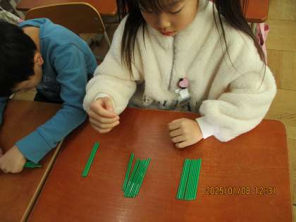 20を超える棒を工夫して数えてもらいました。いろいろな数え方が出ましたが、最終的には10のまとまりを作ると数えやすいとわかってきました。これからの学習が楽しみです。