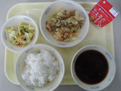 本日の給食ではちくわ・たまねぎ・にんじん・三度豆などが使われていました。揚げたてでさくさくとした食感を楽しみながら、おいしくいただきました。