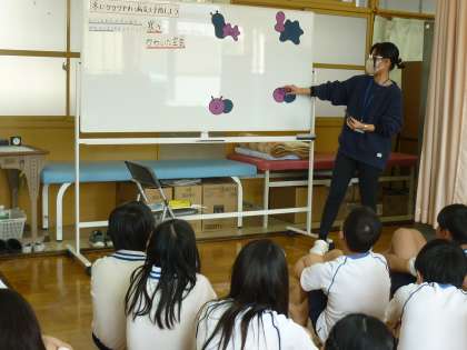 身体計測前には、この時期、風邪を予防するために何ができるかについて、養護教諭から話をしてもらいました。