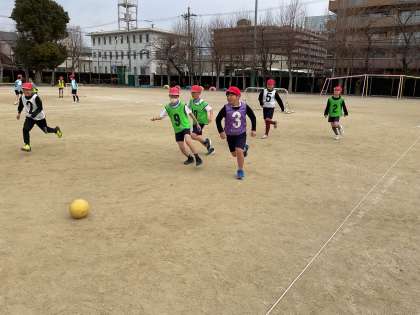 転がってきたボールを「蹴る」という動作は少し難しいようですが、どのチームも試合が白熱しています!