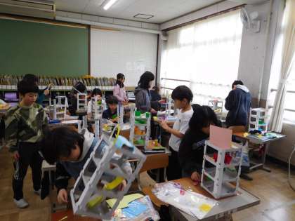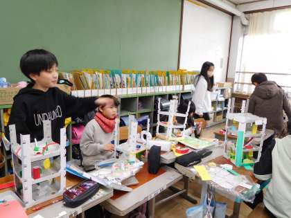「この角度にしたら、穴に落ちる!」、「この階は難しいコースにしよう!」と試行錯誤を繰り返しながら作っています。完成が楽しみです。