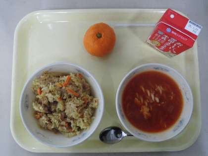 本日の献立は(みかんを除いて)備蓄品を使用した防災献立です。
