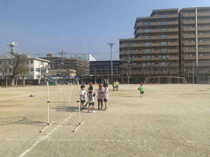運動場では1年生がパスゲームを