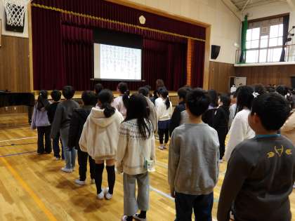 今日の児童朝会は保健委員会の発表でした。ハンカチティッシュの点検の結果をもとに話をしてくれました。明日からも忘れずにハンカチティッシュを持ってきてくださいね!