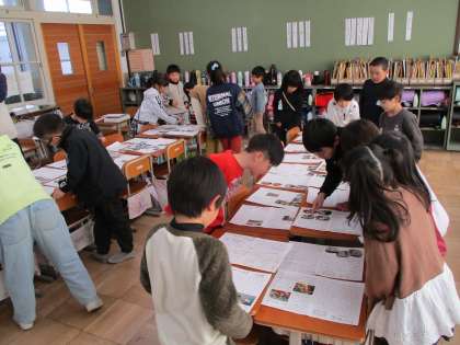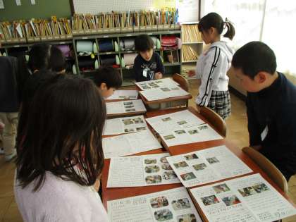 1年間の出来事を思い出すために、「いいね」通信を並べました。興味津々で見る子どもたち。楽しいことがたくさんあった一年間でした。