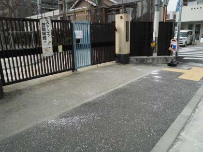 明日・明後日頃にかけて、寒波の到来や雪の予報が出ているため、正門・東門を中心に凍結防止剤を散布しました。(時期により、運動場などへの散布も定期的に実施しています)