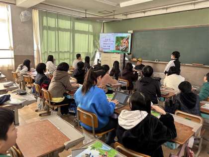 生き物について調べた内容をCANVAでまとめて発表していました。音楽をつけたり、文字の少ないスライドで分かりやすく伝えていました。また、魚の浮き沈みについてペットボトルで実験も披露していて、研究熱心な姿勢に感心しました。