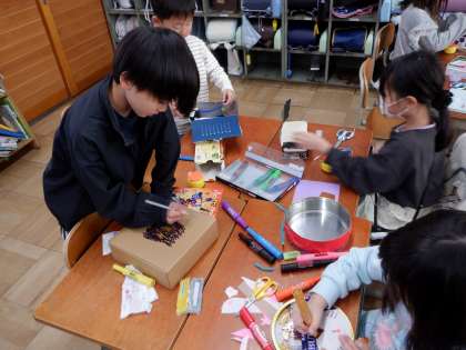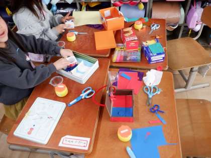 思いに合う形や色を見つけて、大切なもの入れる箱を作りました。画用紙やモールを使って仕切りや飾りをあれこれ工夫しながら作っていました。「アクセサリーを入れよう!」「ゲームを入れる?」と思いを持ちながら楽しそうに作っていました。色々な大きさの箱を準備していただき、ありがとうございました!