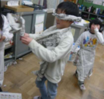 とても楽しそうに新聞紙を使って作品を作っていました。
