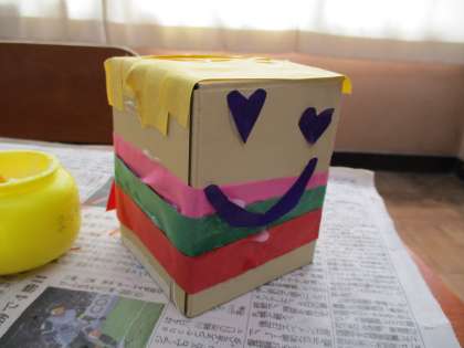 空き箱を使って大切なものを入れる箱を作っています。初めに白い紙で仕切りを作り、そのあとに折り紙や色画用紙を貼ってきれいな箱にしていきました。来週も続きをするので楽しみです。
