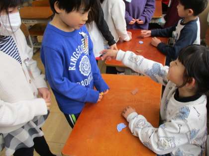 3学期の英語活動は、「ちょうちょをしょうかいしよう」です。色を英語で言いながら色カードをもらいます。お店役とお客役に分かれてやりとりを楽しんでいきます。