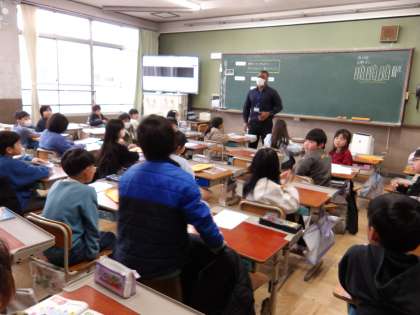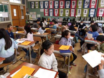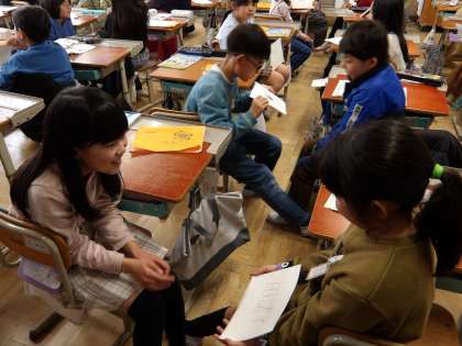 前の時間にそれぞれが漢字クイズやシルエットクイズなどを作りました。作ったクイズを使って「What's this?」とクイズを友だちやALTの先生に出しました。