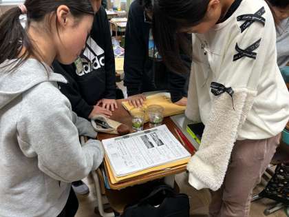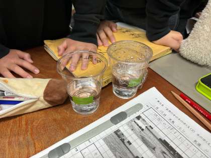 2日ほど置いておいた水が入ったコップ二つ(一つはラップで塞いでいるもの)の様子について確認しています。