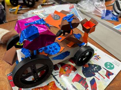 ゴムの力で動く車を、自分だけの車に装飾していきます。