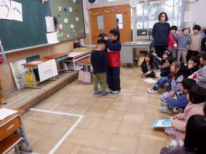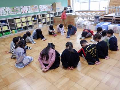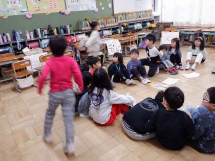 今日は、保育園の年長さんが来てくれ、交流会をしました。最初に名前を書いたメダルを渡して、みんなでいす取りゲームをして遊びました!