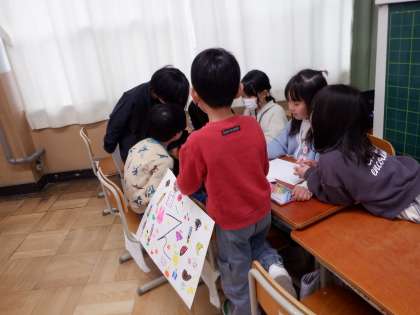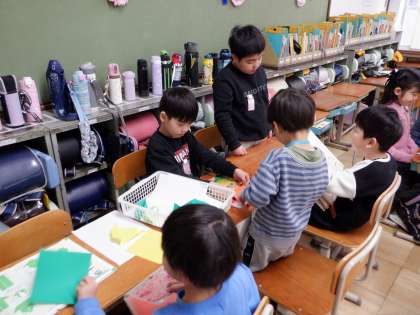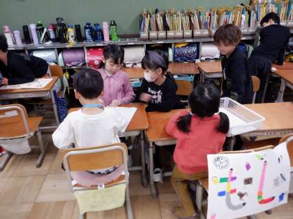 絵を描いたり、文字を教えたり、折り紙を一緒に折るコーナーがありました。優しく声をかけている1年生、とっても素敵です!