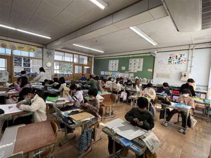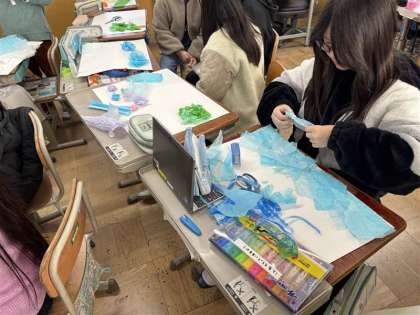 ふれた感じからイメージを広げてストーリーをつくり、友達に伝えます。同じ材料でも人によって違うイメージになり、個性が出てとても面白いです。子どもたちもコミュニケーションをとりながら楽しく学習しています。