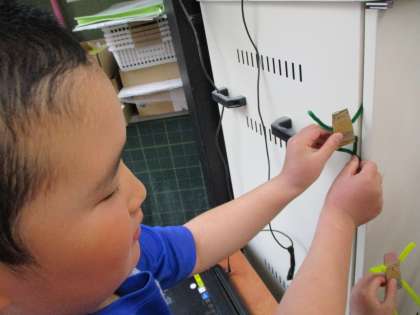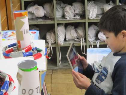 図画工作の時間に段ボールとモールで「すきまちゃん」を作りました。その「すきまちゃん」を思い思いのところに置いて、タブレット端末で写真を撮りました。