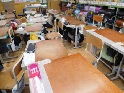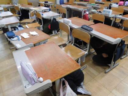 放送で訓練が始まると低い姿勢をとり、頭を守り、動かないという3つの安全行動をとりました。