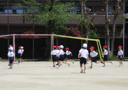 体育の時間に運動場の使い方の勉強をしました。ボールを使うところや鬼ごっこをするところ、使える遊具などを知り、そのあと鬼ごっこを楽しみました。