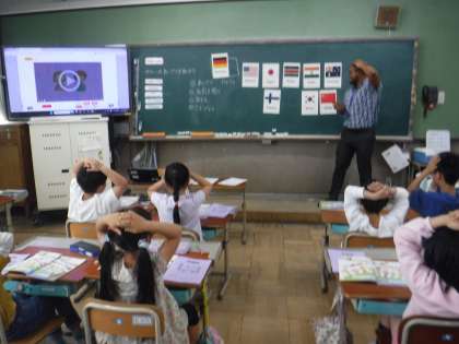 だいたい週に1回、外国語活動があります。初日はALTの先生と一緒に学習しました。いろいろな国の名前やあいさつを学びました。