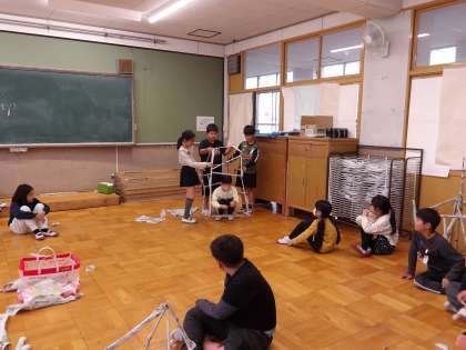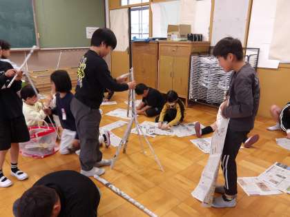 新聞紙を丸めて棒にしたものを組んでいきました。各班いろんなものが出来上がりました!