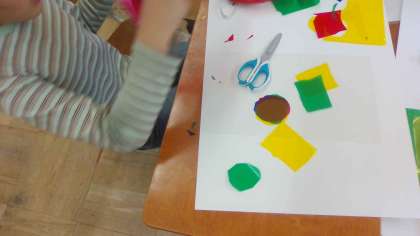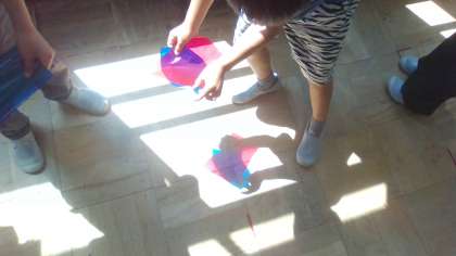 図画工作科「ひかりのプレゼント」の学習をしました。カラーセロハンを光にかざしたり、違う色のセロハンを重ねたりして、いろいろな色や形を作ることを楽しみました。「赤と青を重ねたら緑になった!」「細かく切ったら花びらみたいできれい!」とたくさんの発見をしていました。