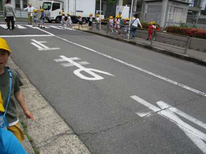 学校の近くの道を歩き、標識や横断歩道、路側帯などを見つけました。子どもたちの安全を守るものがたくさんあることに気付きました。