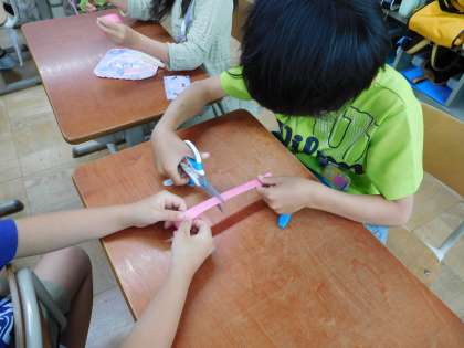 算数の「長さ」の学習で10cmの長さをもとに、身の回りの物の長さを予想して測りました。