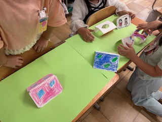 「おってたてたら」の学習で、画用紙を折るとたつことをつかって作品をつくりました。