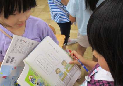 動物園の絵を見て、二人組で話す勉強をしました。「どの動物がみたいですか。」「クジャクが見たいです。どうしてかというと、羽がきれいだからです。」とわけを伝える言葉を使ってみました。いろいろな人と会話をすることが楽しかったようです。