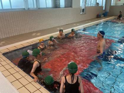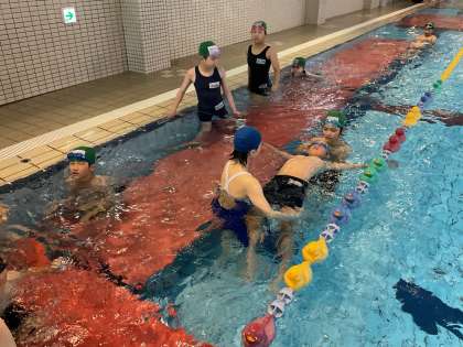 バディを組み、背浮きの練習や、クロールの練習、とにかく速く泳ぐ…など、それぞれのめあてに向かって頑張っています。