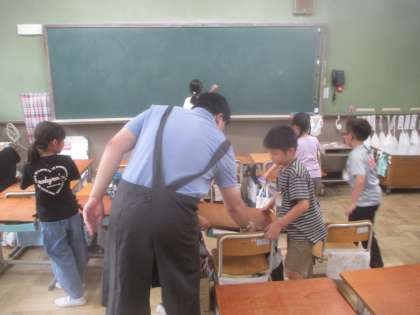給食のあとは、そうじも見学されました。一緒に机を運んでくださって、いつもよりも掃除に力が入っていました。お別れの時はとてもさみしそうで、たくさんハイタッチをしてもらいました。また交流できる日が来たらいいねと話をしていました。お家でも、たくさん話を聞いてあげてください。