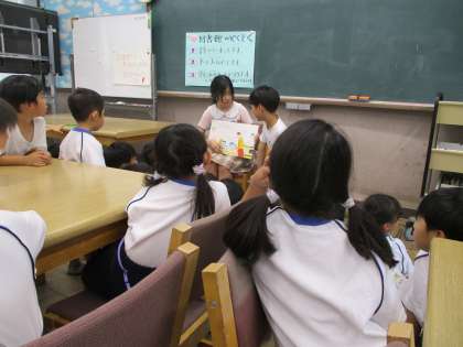 23日(月)の中間休みに図書館で図書委員さんが読み聞かせをしてくれました。題名は『ハンタイおばけ』です。1年生は、お話の世界にどっぷりとつかって、楽しんでいました。図書委員のみなさん、ありがとうございました。