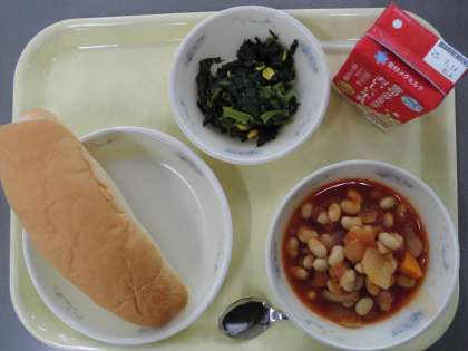 大豆と鶏肉のトマト煮は、大豆のあま味やトマトのうま味を味わいながら、おいしく食べている姿が見られました。