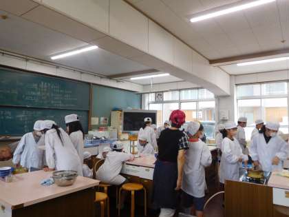 5年生の家庭科の調理実習に、地域の学校ボランティアの方に来ていただきました。