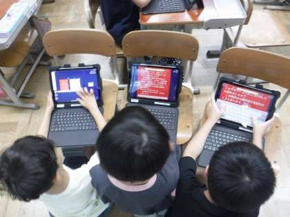 他の小学校3年生に向けての校区の紹介作りがいよいよ終わりそうです。みんなタブレットを使って自分が話す言葉や写真、映像を作っています。