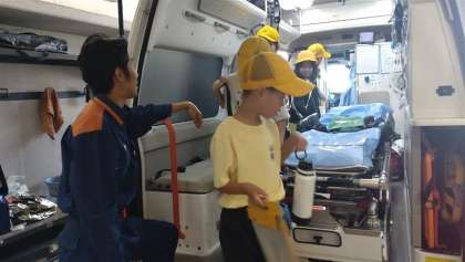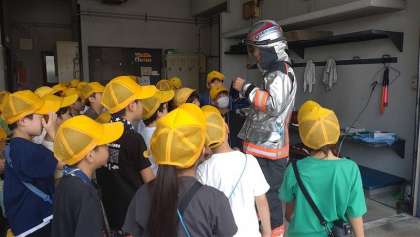 今日は、南区西八条出張所へ行って来ました。間近で見る消防士さんや救急救命士の方はやっぱりかっこよかったです。行った後に消防士になりたい!!と思った子もいました。消火活動の時の服を見せてもらったり、消防車や救急車も忙しい中でしたが見させていただきました。