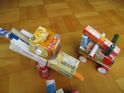 持ってきた箱を積んだり並べたりして思いついたものを作りました。「とかげ」や「キリン」などの生き物や「がちゃがちゃ」「パソコン」「自動車」などの身近なものを思い思いに作り上げました。授業の終わりには、自分の作品のおすすめを書き、友達の作品の良いところを発表しました。