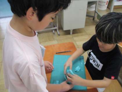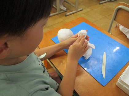 粘土を使って自分と一緒にお散歩したい生き物を作りました。「きょうりゅうとおさんぽにしようかな。」「うまにのっているところにしたいな。」と思いついたものを形に表し、満足そうでした。友達の作品も見て、楽しい時間となりました。
