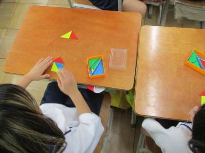 三角の色板を使って、形づくりを楽しみました。いろいろと試しながら、「できた!」と喜びの声をあげて、楽しんでいました。