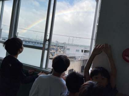 朝、教室の前のろう下からきれいな虹が見え、みんな大喜びしていました。