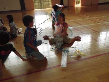 3年生は,図工で工作「ふんわりふわふわ」という学習をしました。身近なポリ袋を使い,風の力を利用して,形や色・動きを工夫して浮かび上がらせるものをつくろうというものです。この日は,教室でつくったあと体育館で送風機やうちわを使って浮き上がらせました。