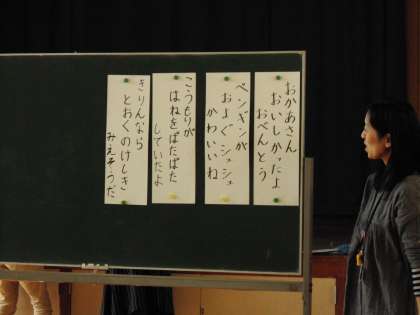 本校では,国語の研究に取り組んでいます。その取組の一つとして句会を行っています。今回の句会のテーマは「あきのえんそく」。季節を盛り込むのが俳句ですが,今回は1年生が初めてということで,特別ルールになりました。「五・七・五」のリズムを大事にして作りました。1人ひとつ考えた後,いくつかの友達の作品のいいところをみんなで見つけて,俳句を味わいました。次回は季節を盛り込むことにレベルアップします。
