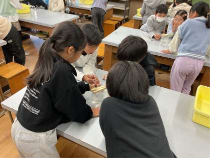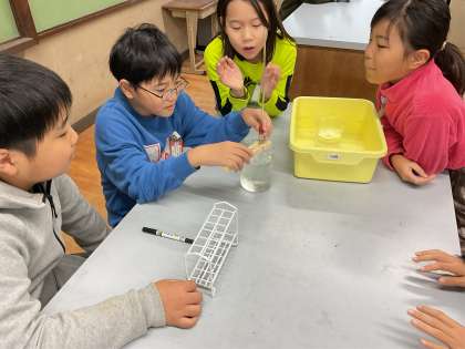 水の温度をかえると体積はどうなるのかの実験を行いました。「さすがに体積はかわらないだろう…。」という予想も多い中、実験を通して冷やすと体積は小さくなり、あたためると体積は大きくなるということがわかりました!