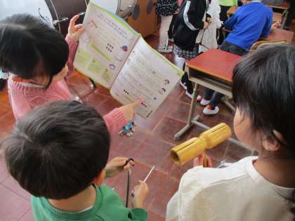 音楽室で学習をしています。ウッドブロックやトライアングル、すずを使って歌いながら演奏をしました。グループでの発表も素敵でした。