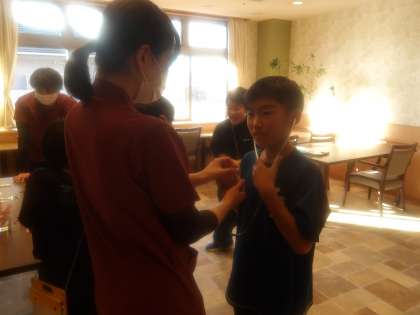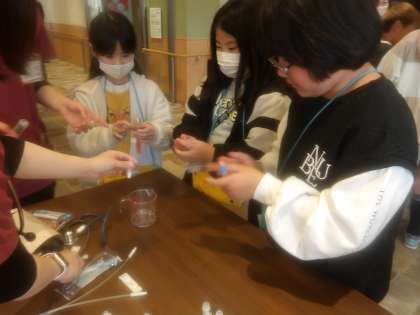 看護体験では注射器の使い方や聴診器について教えていただきました。普段は触ることのないものだったので、子どもたちはとても楽しそうでした!