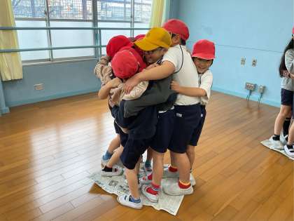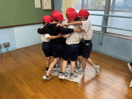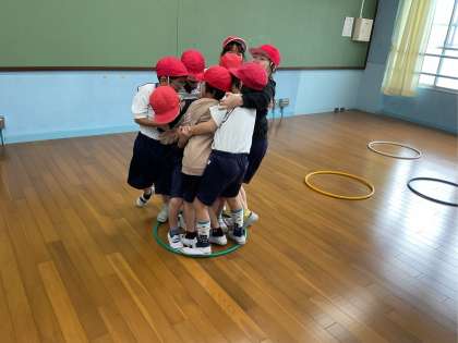 今日はあいにくの雨だったので、プレイルームで体育をしました。今日のねらいは、『体をうまくつかう』ことです。新聞紙の上に何人乗れるかチャレンジや、フープの中にみんなで入れるかなどをやってみました。